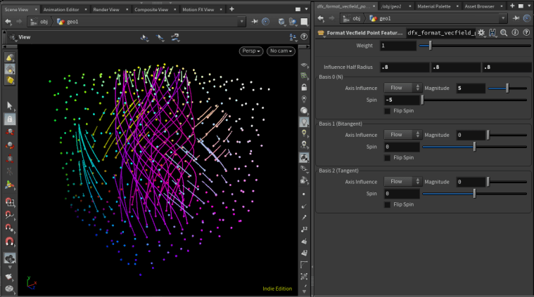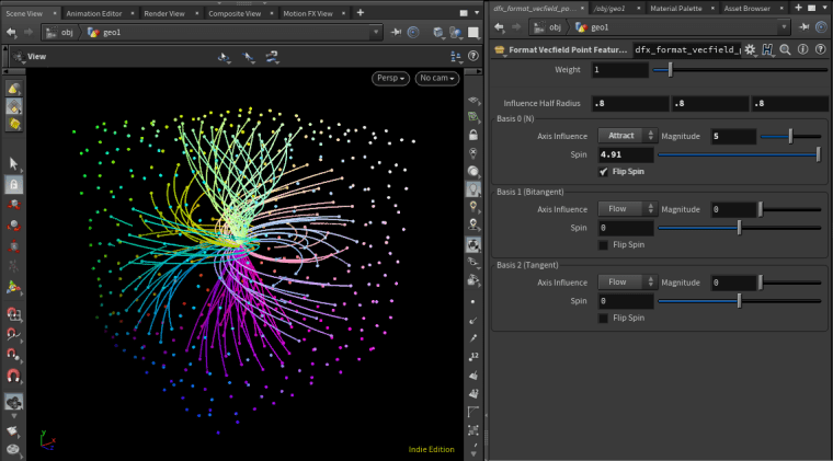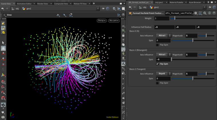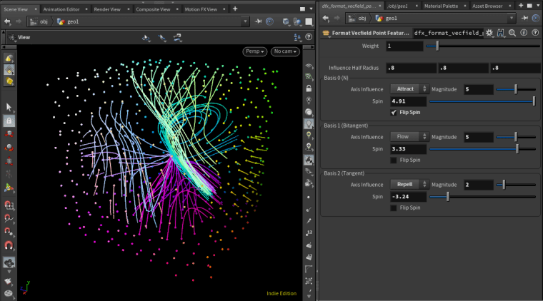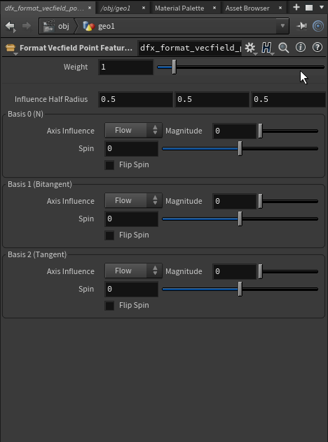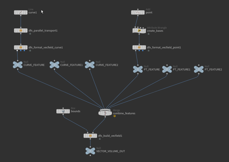 In effect, these tools allow you to generate ‘features’ in the vector space from points or curves. Features are represented by a set of basis vectors defining their local space, and the effect along each of these bases (e.g., attract vs repel, spin, flow). The overall influence at any given point in space is calculated as a weighted average of these effects (weighted by distance, feature strength, and basis projections).