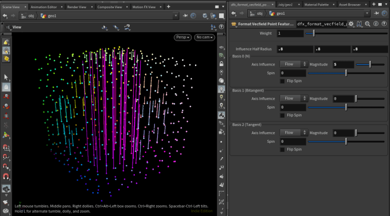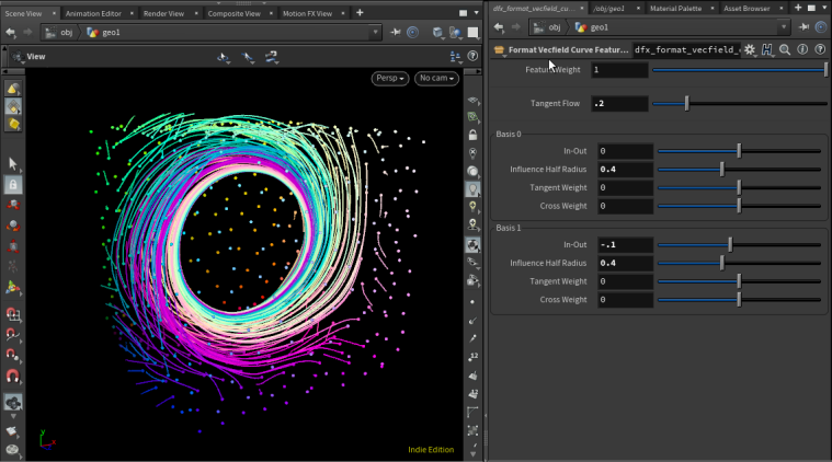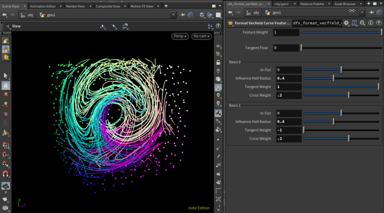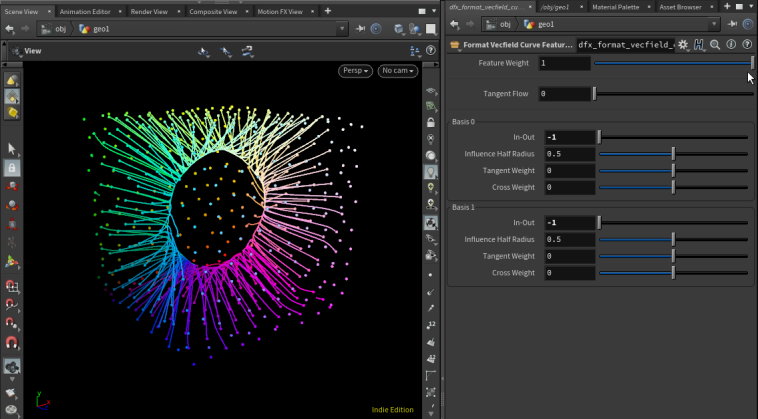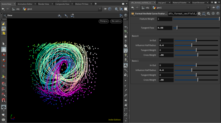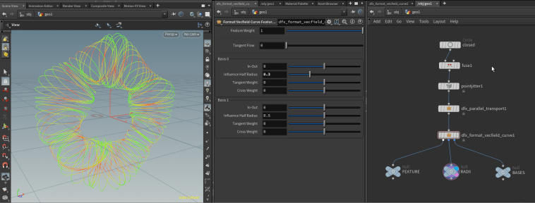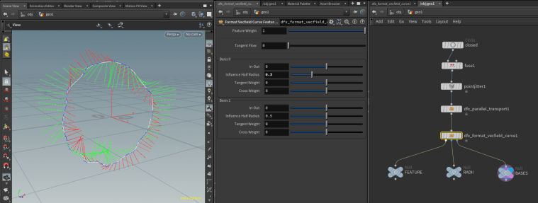 Outputs: Primary output is a curve feature ready to be passed to Build Vector Field node. Two visualization outputs also provided: Output 1 visualizes influence half radius Output 2 visualized the basis vectors (scaled by influence half radius)
