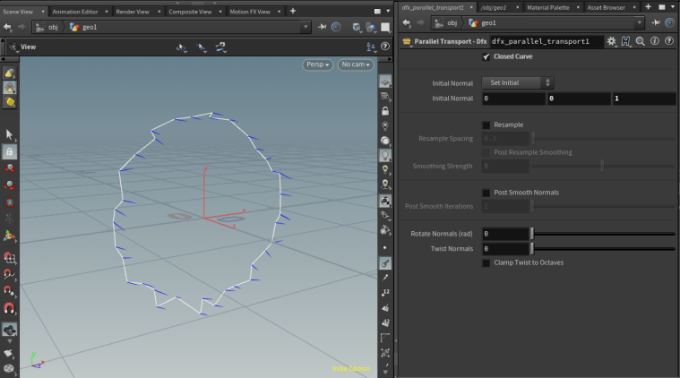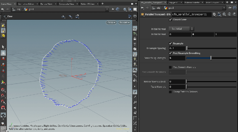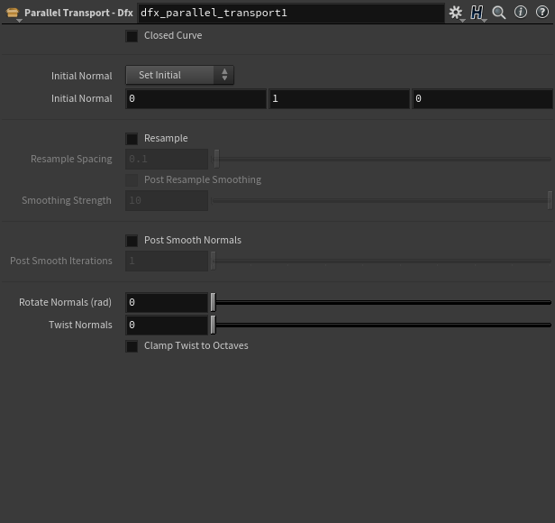 Initial Normal: Choose from Set Initial (which takes a user specified starting normal for point 0), or Use First Point (which assumes an existing N attribute on point 0).